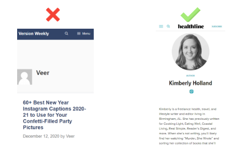 (E-A-T): Bad author archive vs. good author archive. Show the real author (profile picture, socials, bio) behind the article.
